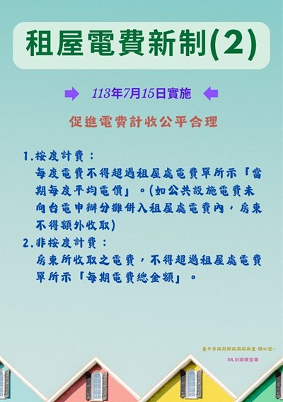 每度電費不得超過租屋處電費單所示「當年每度平均電價」。(如公共設施電費未向台電申辦分攤併入租屋處電費內,房東不得額外收取)