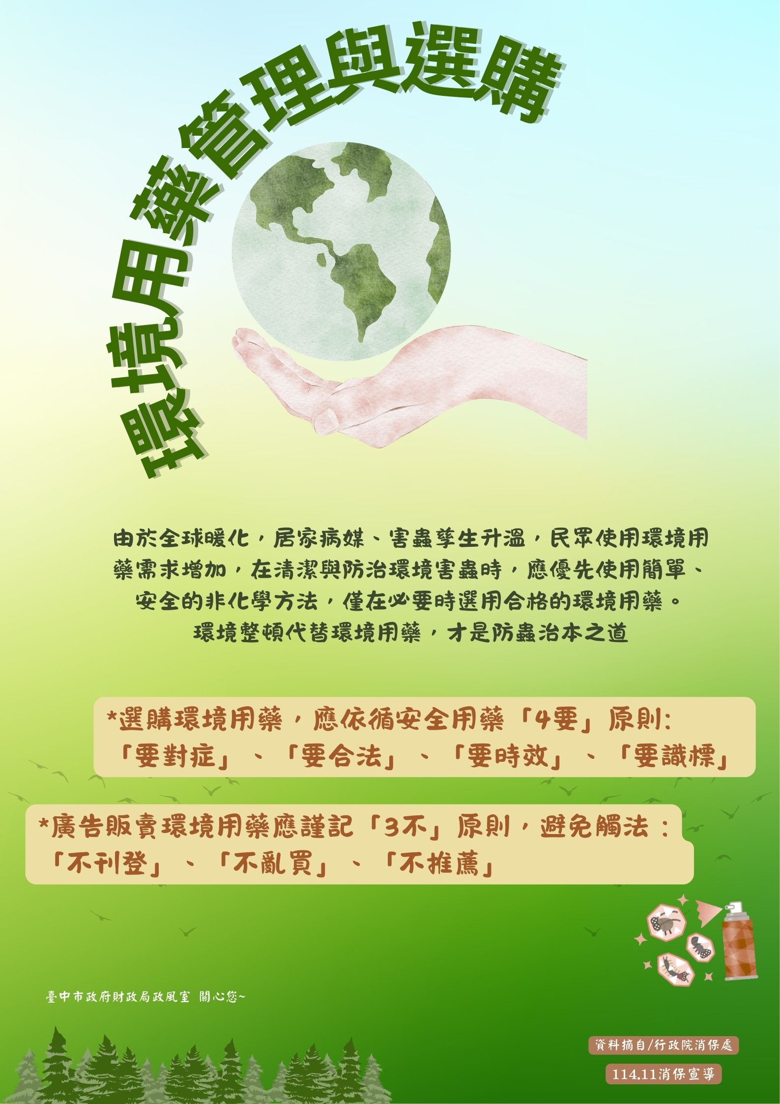 由於全球暖化,居家病媒、害蟲孳生升溫,民眾使用環境用藥需求增加,在清潔與防治環境害蟲時,應優先使用簡單、安全的非化學方法,僅在必要時選用合格的環境用藥。環境整頓代替環境用藥,才是防蟲治本之道。