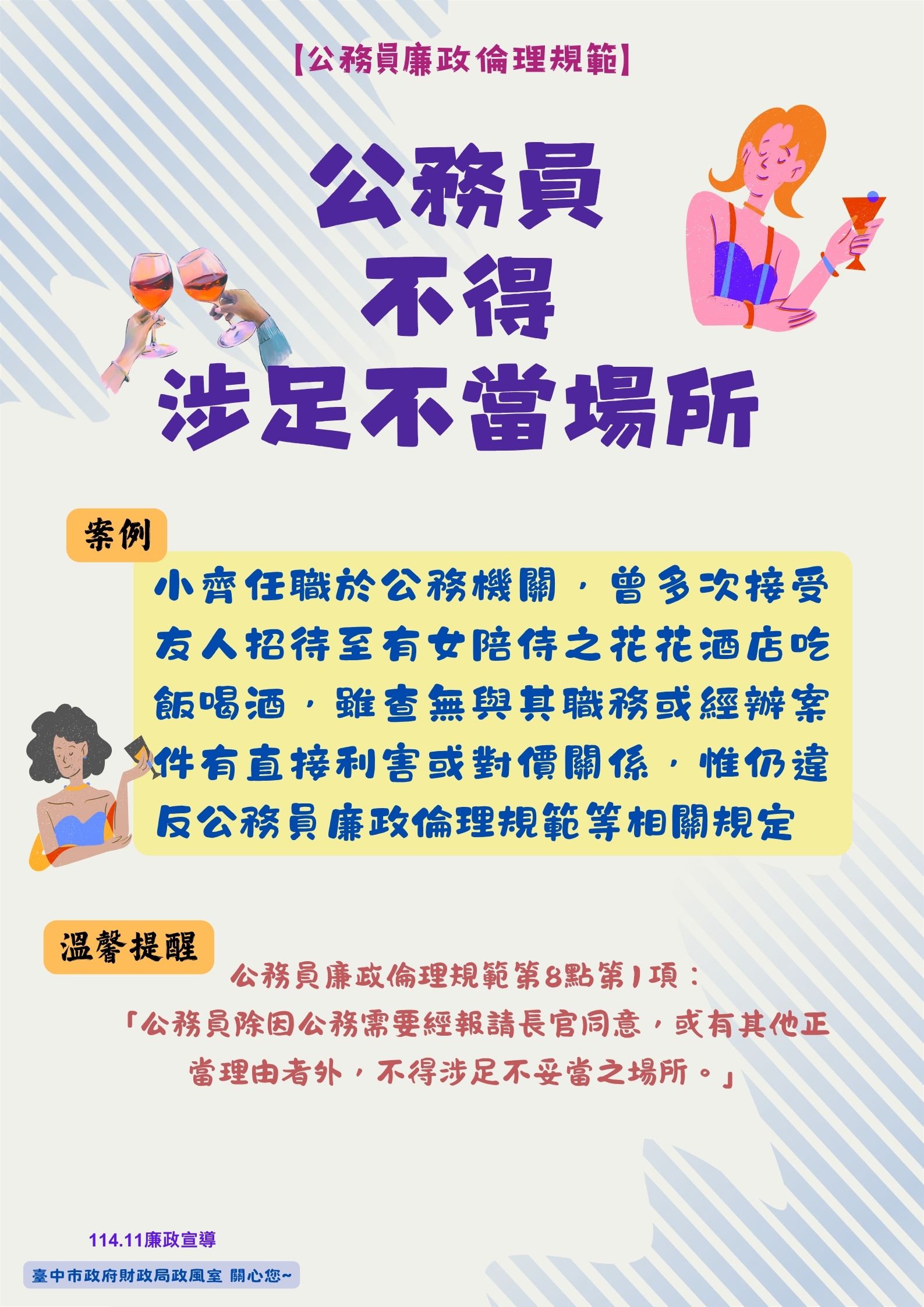 小齊任職於公務機關,曾多次接受友人招待至有女陪侍之花花酒店吃飯喝酒,雖查無與其職務或經辦案件有直接利害或對價關係,惟仍違反公務員廉政倫理規範等相關規定