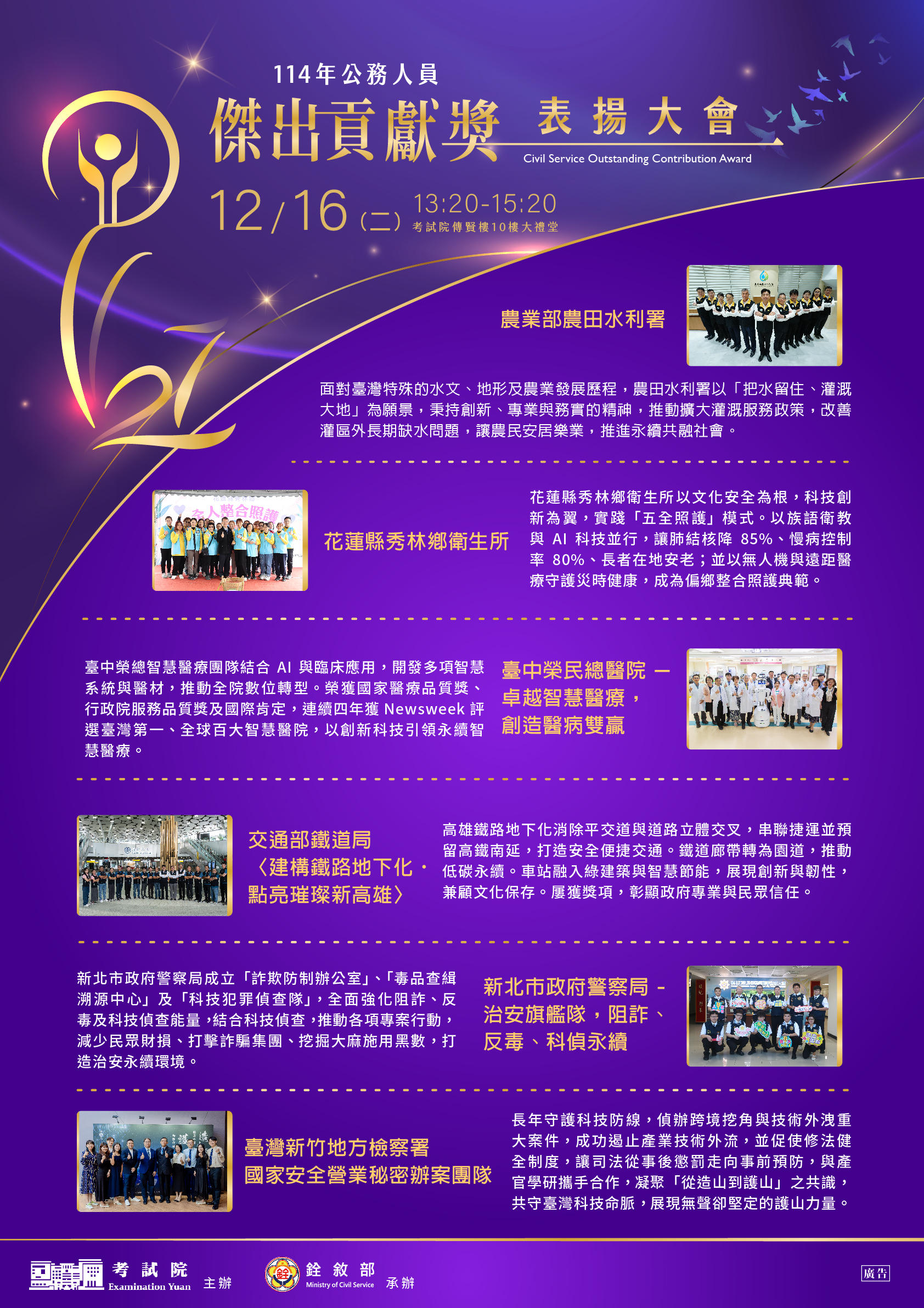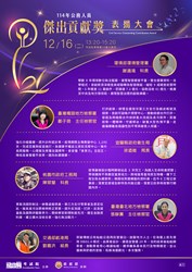 本(114)年公務人員傑出貢獻獎業經考試院組成評審委員會評選出6名得獎人及6組得獎團體。為表揚得獎者傑出事蹟,考試院訂於12月16日(星期二)下午1時20分於考試院傳賢樓10樓大禮堂舉行表揚大會。