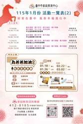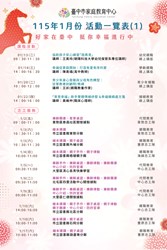 臺中市家庭教育中心【115年1月份活動一覽表】 搶先開箱! 以陪伴大家增進自我成長,促進家庭和諧,提升親子、伴侶親密關係為目標,精心規劃貼近生活議題的多元課程活動,誠摯邀請您一起參與! 迎新年特別企劃 「為爸爸加油」系列短影音迷你劇➩➪推出臉書留言抽獎活動,歡迎踴躍觀片留言,一起為爸爸們加油打氣