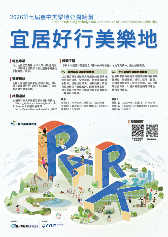 為持續促成高等景觀教育與國際潮流及專業實務的銜接,2026 年第七屆臺中美樂地公園競圖,以「宜居好行美樂地」為主題,設計子題包括「韌性防災公園創意競賽」及「十五分鐘生活圈創意競賽」,旨在結合設計創意與科技應用,探索公園在氣候韌性、社區共融、生活便利及生態永續等多種功能上的可能性,鼓勵青年設計者提出兼具創新性、實用性與社會價值的前瞻性方案。期望透過本屆的學生競圖,觸發學生對環境議題的研究及人本環境的營造,落實環境永續發展願景。