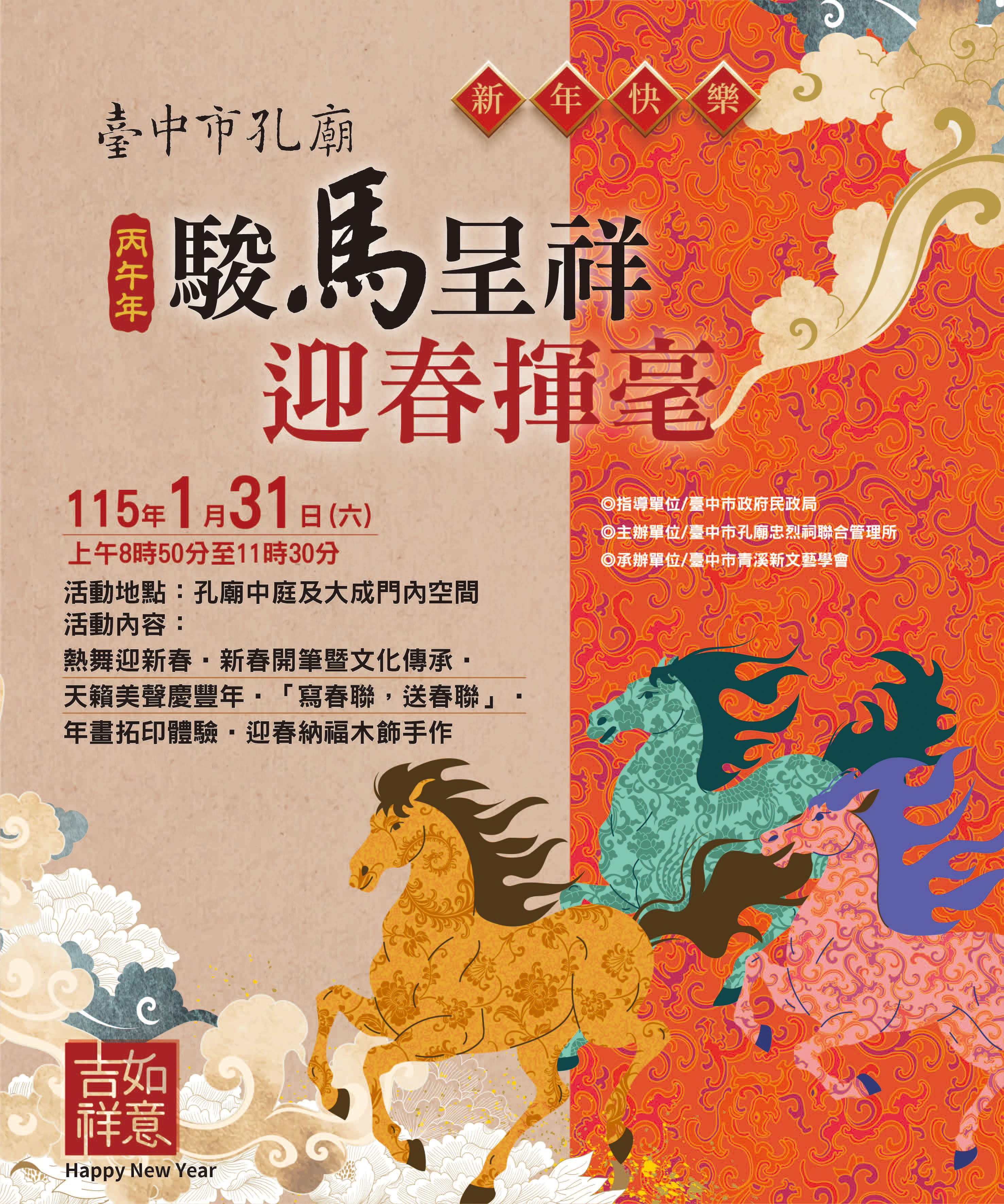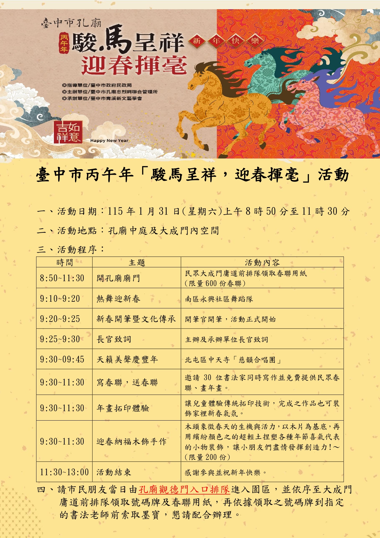 活動當日市民朋友可由孔廟觀德門入口排隊進入園區領取春聯用紙,並於開場表演後由30位書法名家現場揮毫,為民眾提供免費寫春聯畫年畫(限量600份),另規劃兒童年畫拓印體驗區及迎春納福木飾手作(限量200個)區,讓小朋友親自動手拓印年畫及製作年節吊飾,體驗動手玩創意的樂趣,所得春聯及完成之作品皆可於農曆年節前夕布置家中新春氛圍。