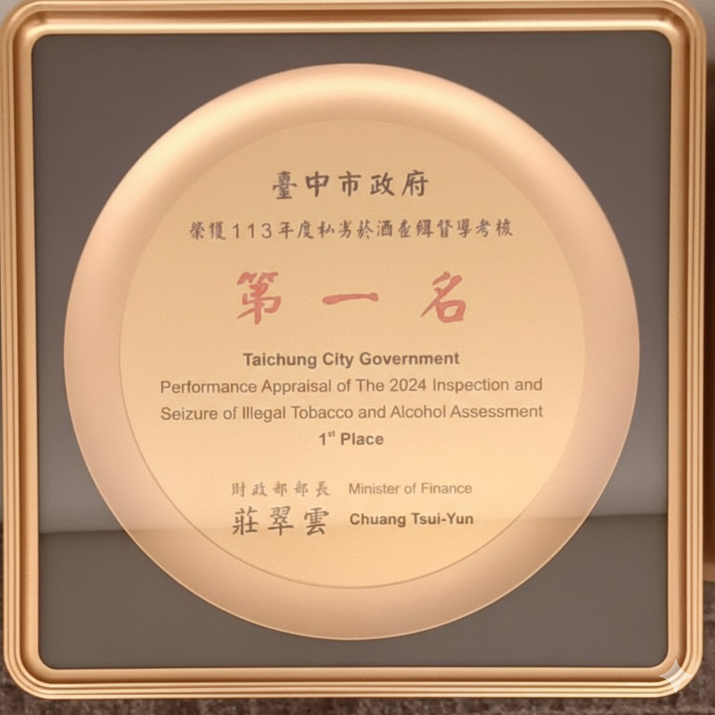臺中市政府113年度私劣菸酒查緝績效考核榮獲全國第一名